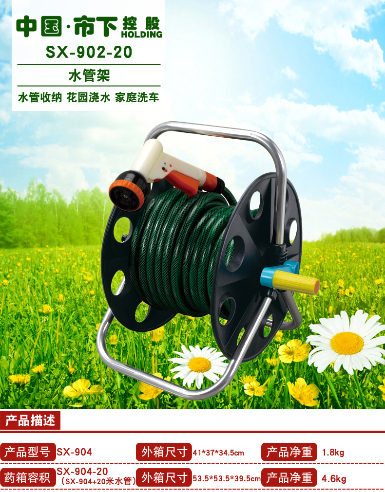 | 产品规格 | SX-904 水管车 不含水管,SX-904 水管车 含20M水管 | 规格 | SX-904水管架不含水管,SX-904-20水管车含20m水管 |